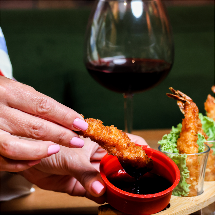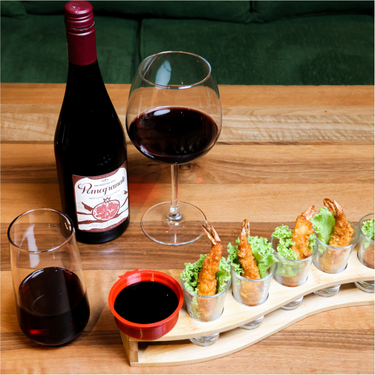 Crispy golden shrimp, delicately dipped in our rich, aromatic pomegranate molasses, delivers an unforgettable burst of flavor—the perfect harmony of sweet, tangy, and savory. Each bite is a celebration of the sea, elevated by the deep, velvety notes of our finest pomegranate wine.